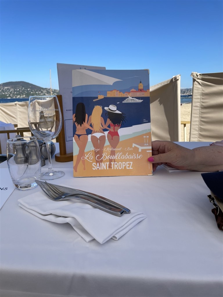 A waiter dressed like a footman from Downton Abbey showed us to a table right on the beach and gave us menus about twenty pages thick. As they were in French, obviously, I said to G, ‘you choose, it’s your birthday,’ which I thought was pretty clever.