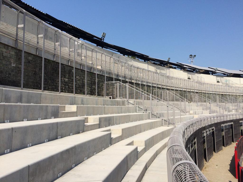 It’s not a good look. Inside, it’s even worse. There’s seating for 5,000 on stone benches around a central arena, complete with football stadium style barriers.
