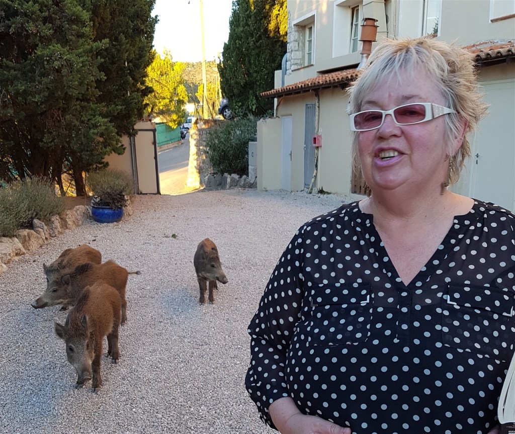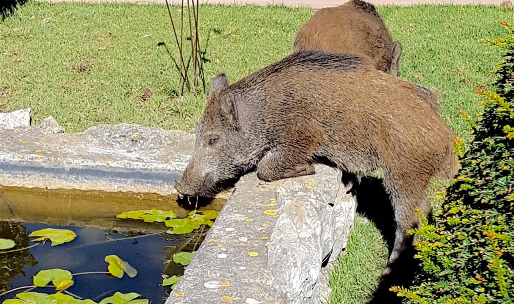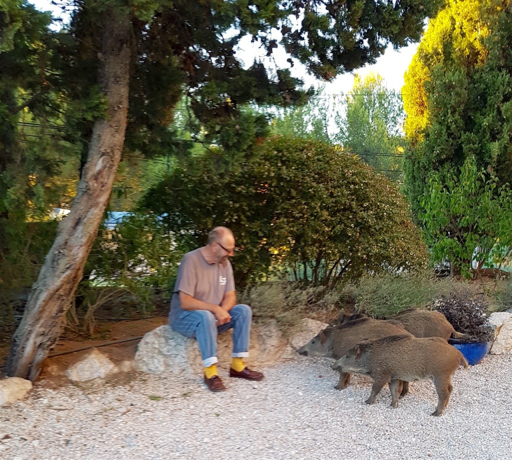 G went to sit by the pool, but was soon back telling me, commanding me, to come down NOW. I rushed to obey, as ever, (ha!) and was so glad I did as there was a whole family of wild boar in the garden. They came to drink from the fish pond and G was able to get within touching distance, although all the other guests were cowering behind the locked gates of the pool. He is such a hero, they must have thought, but we used to see them regularly when we lived in Spain and they are only aggressive when threatened. The big one wandered off leaving just the little ones behind so I was okay to get close. Like hairy dogs, even down to their wagging tails!
