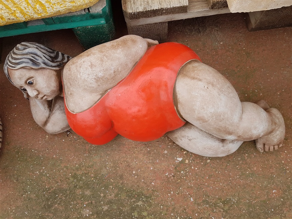 There was an enormous black woman in tribal costume with a hump on her back, which turned out to be a fab baby girl with beads in her hair. She was selling very large bras and knickers, the sort of knickers that have legs in and make you look thinner. There were a lot of Spanish women having a rummage. I asked her where she was from and she said ‘Gambia’.