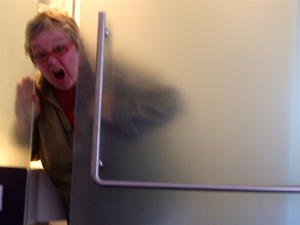 Marigold demonstrating the potential dangers of automatically closing shower cubicle doors in our last night hotel