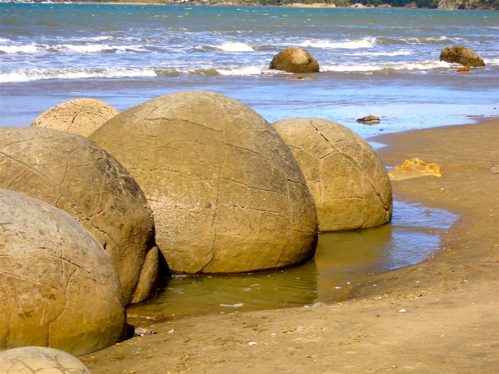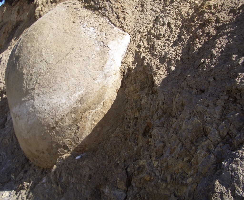 The bigger boulders weigh several tons and we found several more partly exposed on the softer cliff face about to join the others on the shore. It appeared the supply of new arrivals was ongoing. The scientific explanation for this unique phenomenon was that the boulders were calcium concretions formed over 60 million years ago, but Marigold preferred the dinosaur egg idea.