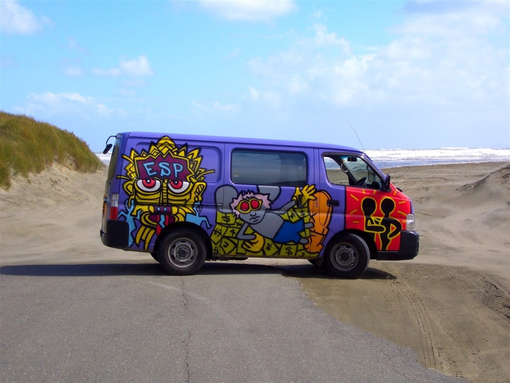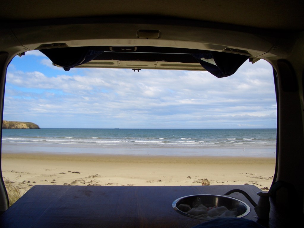I talked surfing with him for a while, somehow I resisted his offer to lend his spare board so I could check out the huge waves at close quarters (!) and he asked if we were just passing through or staying locally. I pointed out our van, still visibly swaying despite being reasonably sheltered from the wind.