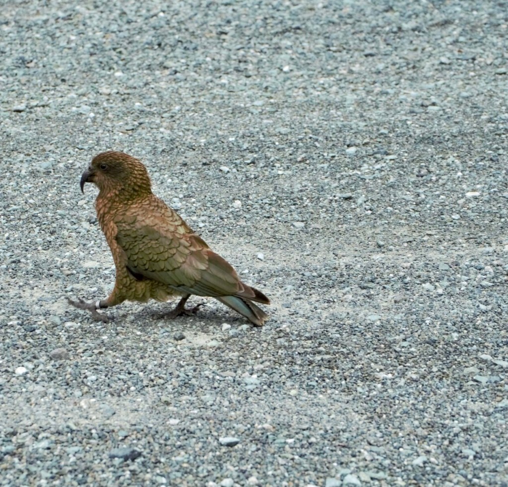 It was misty up here in the clouds, pretty cold and there were kea ‘parrots’ flying everywhere, so many of them Marigold refused to leave the car, muttering something about an Alfred Hitchcock film. Kea are on a par with seagulls in Cornwall for nuisance value, but far more attractive. We’d seen many signs asking people not to feed them, but plenty of people did.