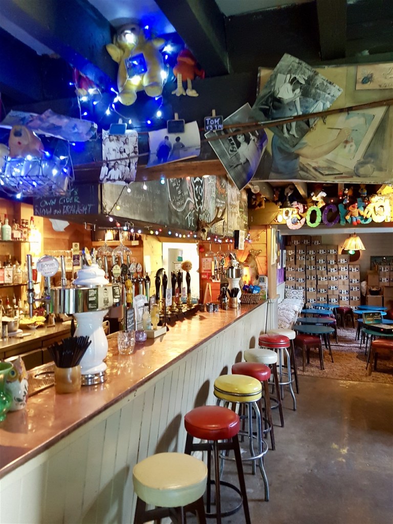 The pub in Lower Godney is called the Sheppey Inn and has been there for hundreds of years. It’s not exactly inviting from the outside, pretty scruffy actually, but inside it’s lovely. The owner is named Liz and she told us all about the pub. She and her partner, Mark, used to own the Wookey Hole Inn and won many awards there, but took over the Sheppey eight years ago when it was very run down. Liz collects glass, Mark collects toys and the pub is packed with knick – knacks, big pictures and wonderfully eccentric furniture. We loved it.
