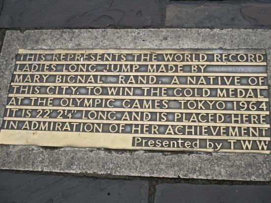 Wells is named after the three wells, what a surprise, and there is a fountain in the market square, but I’m not sure that’s one of the three wells. There’s also a plaque marking Mary Rand’s World record long jump ‘ she was born in Wells – and there’s a brass strip on the pavement marking out the distance. It looked a very long way to me. If I did my best ever long jump, repeated six times, I’d still only be halfway there! She was the first British woman to win an Olympic gold medal and also held the world record in the Triple Jump. No wonder they gave her the Freedom of the City.
