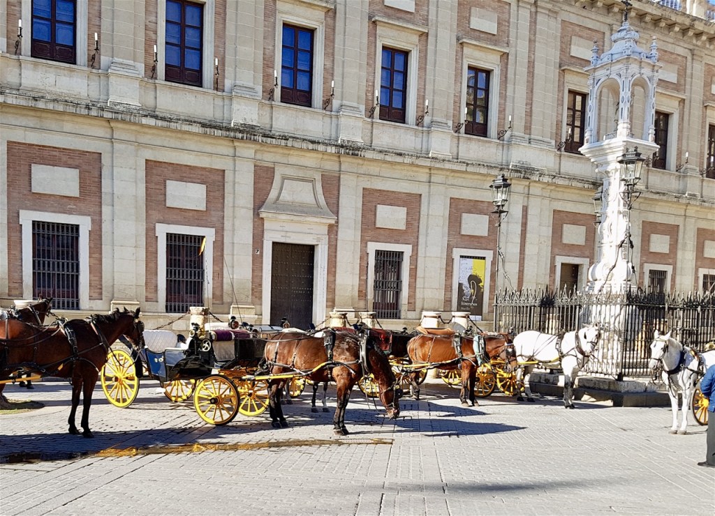 This is our fifth visit to Seville and we know parking is impossible in the old part so the girl at the desk rang for a taxi for us. The car was a hybrid, G said – I never noticed – and most of the way we drove on electric power so very quiet. The driver went through lights on red, cut across traffic lanes and made me wish I’d stayed in bed, but we got there in one piece.