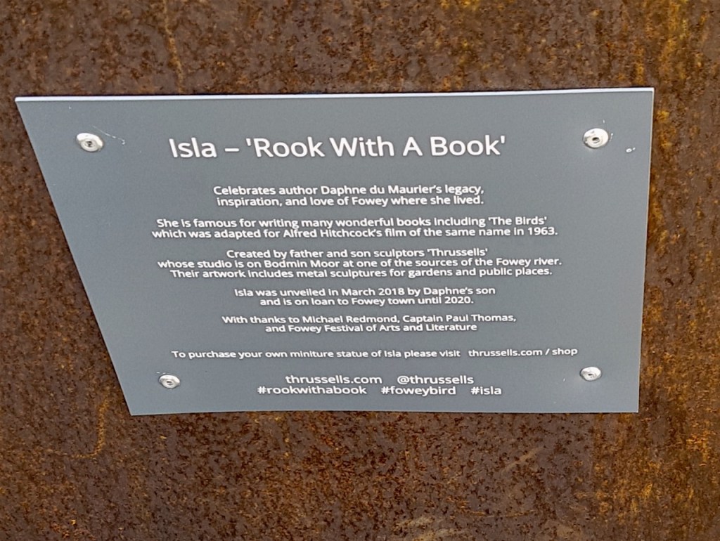 We passed Fowey Harbour Offices and the quay where Queen Victoria and Prince Albert landed on their visit to the town. Alongside is a striking sculpture, Rook with a Book, inspired by local author, Daphne du Maurier’s book The Birds and transposed into a memorable film by Alfred Hitchcock.