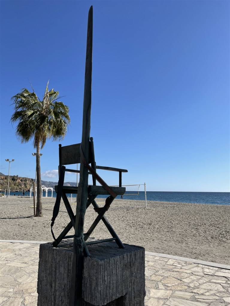 We’ve been here on numerous occasions and this was the first time we found free parking spots straight away. At least twenty of them. There’s a beach, a good one, with restaurants all along the ‘main road,’ the only road actually, and many more fronting onto the beach itself and that’s about it. The Paseo Martimo Antonio Mercero is named after the producer of the famous Spanish TV series of the 1980’s ‘Verano Azul’ ‘ ‘Blue Summer’ – which was set in Nerja. A commemorative sculpture, a director’s chair, has been erected on the promenade. Most people I’ve spoken to think it’s supposed to represent a lifeguard’s chair.