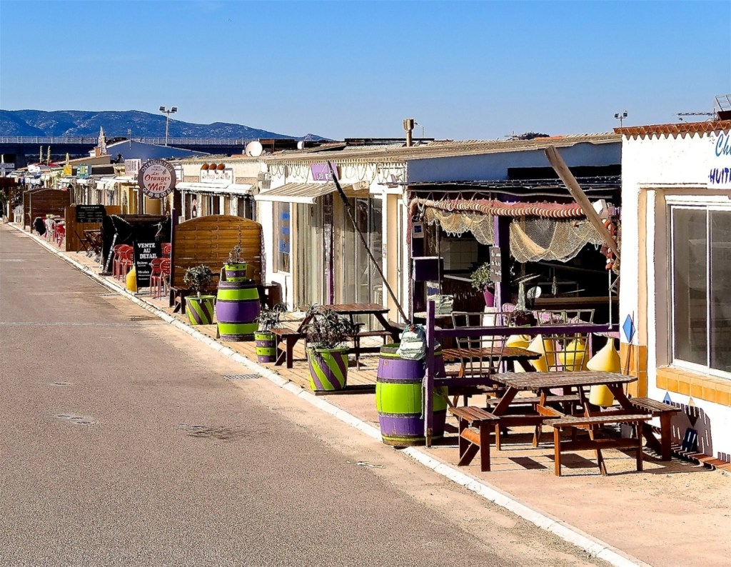 On the way out today, we called again at the lagoons to see if the oyster sellers’ stalls were as crammed in the early morning as they had been at lunchtime yesterday. First impressions: we had come to the wrong place! For at least five minutes we appeared to be the only people there, but then we found the boats tied up round the back and their skippers shucking (think that’s the right word for de-shelling oysters) like men possessed. The stalls looked lovely in the morning sunshine, far better than when jam packed with slurping customers.