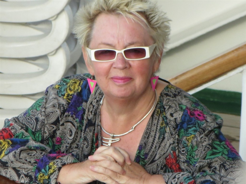Marigold outside the Cafe Pablo. Dressing up day today.